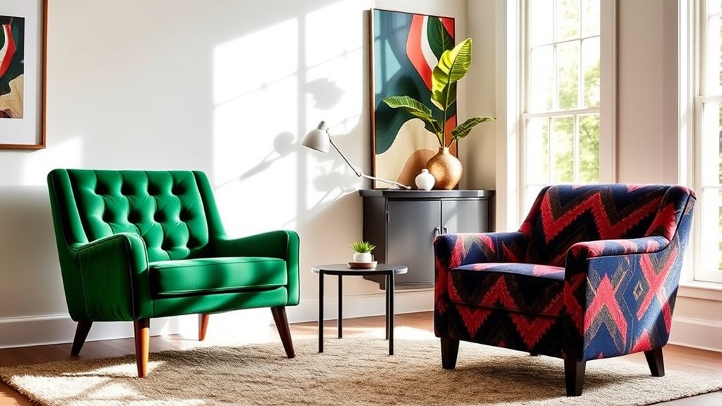 Choosing colors and patterns that pop can instantly elevate your statement accent chair from simply stylish to unforgettable. Bright, bold hues like emerald green, royal blue, or fiery red draw the eye and create a focal point in your room. Don’t shy away from playful patterns—geometric shapes, florals, or abstract designs add personality and energy. Contrast is key: pairing a vibrant chair with neutral walls or accessories makes it stand out even more. If you prefer subtlety, opt for a patterned fabric that incorporates pops of color, giving your space depth without overwhelming it. Additionally, understanding color psychology can help you select décor elements that resonate with your personal style and cultural identity. Incorporating personal preferences into your choices ensures your space reflects your unique taste. Remember, your goal is to make a statement, so choose colors and patterns that reflect your personality and complement your overall decor style. Consider exploring keto diet apps to inspire your healthy lifestyle choices, which can also influence your home decor preferences by encouraging a balanced, vibrant environment.