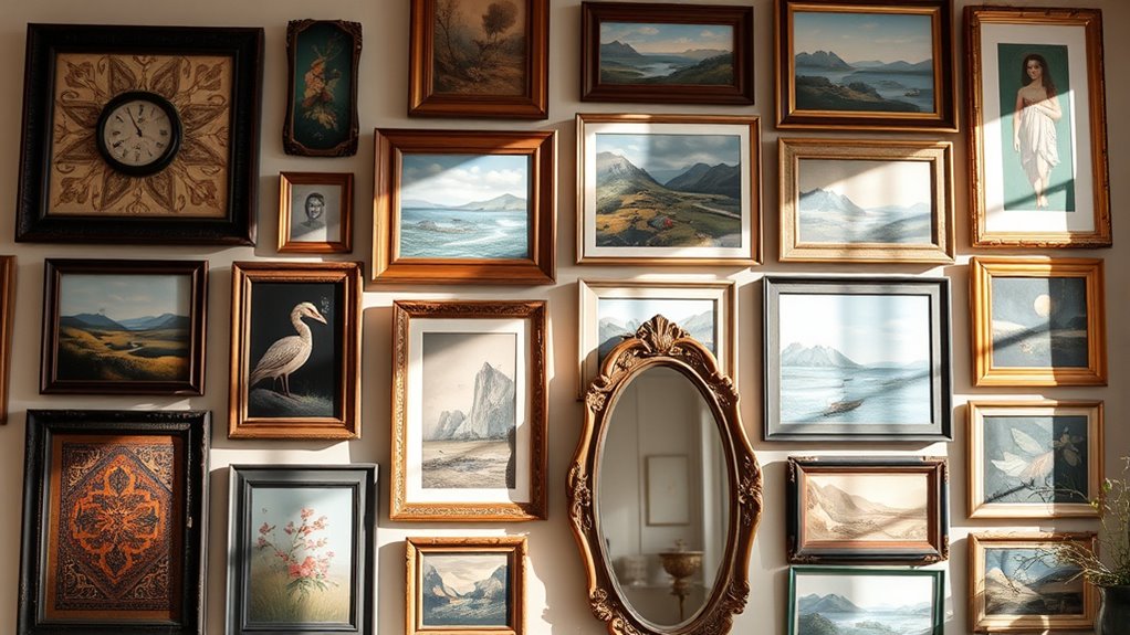 Creating a gallery wall is all about showcasing your personality. Start with your largest piece as an anchor, then arrange smaller artworks around it, keeping about 3 inches of space between each. Choose a cohesive color palette that complements your decor, and mix different frame styles and sizes for visual interest. Don’t forget to add unique elements like textiles or personal souvenirs to tell your story. Discover more tips to enhance your gallery wall’s charm!