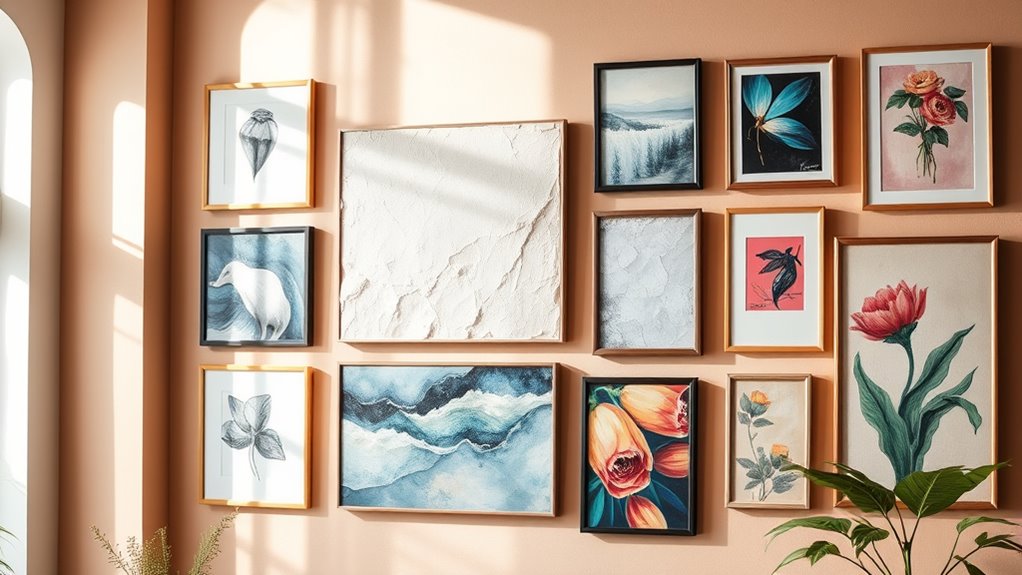As you step back to admire your gallery wall, remember that each piece tells a story, weaving together your unique journey. By thoughtfully selecting and arranging your artwork, you’ve transformed a blank space into a vibrant reflection of who you are. Don’t hesitate to mix in personal touches that spark joy; after all, your home should feel like a warm embrace. So, go ahead—let your creativity shine and make that wall a true masterpiece!