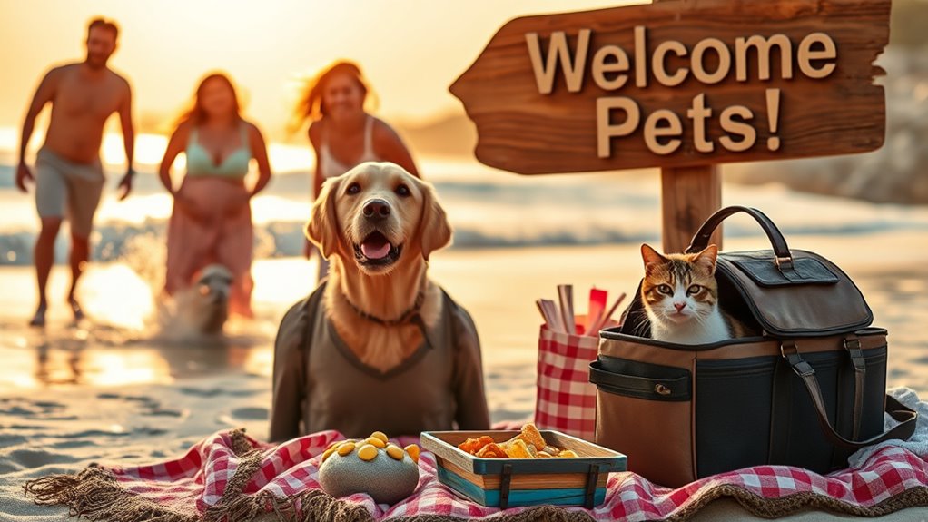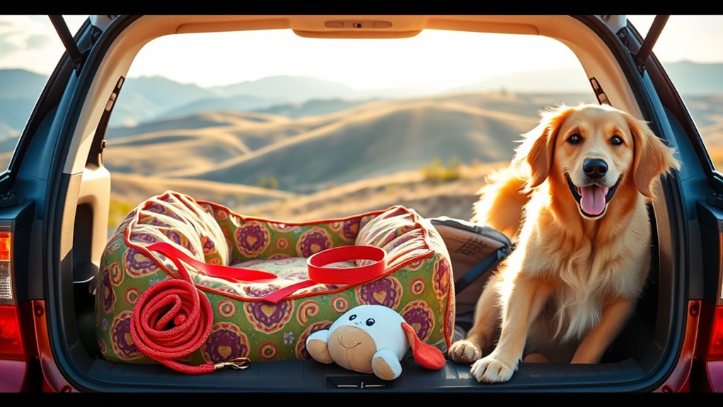 Look for pet-welcoming accommodations that provide amenities such as pet beds and designated areas for your pup. It’s also wise to check for local veterinary services and emergency clinics to guarantee your pet’s health and safety. Additionally, consider setting a budget that includes pet-related expenses such as food and accommodations to ensure a smooth trip.