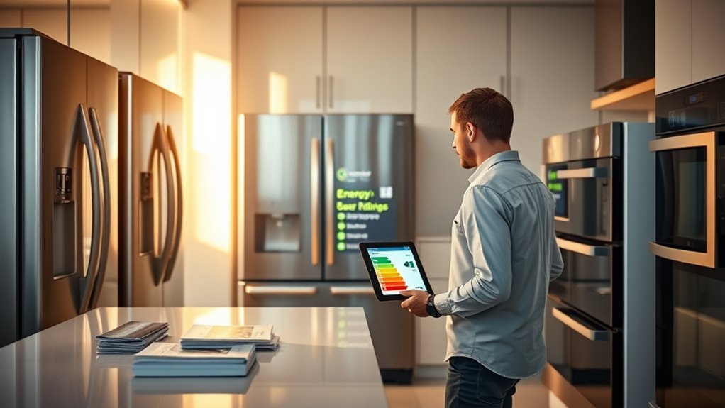 When choosing energy-efficient appliances, focus on labels like ENERGY STAR or the EU Energy Label, which show how well the appliances perform compared to standard models. Assess your household’s needs to avoid oversized units and look for features that reduce energy use, like smart sensors or inverter technology. Consider long-term savings versus initial costs, and check brand reviews and incentives that can make your purchase even more cost-effective. Keep exploring to find more tips that will help you make the best choice.