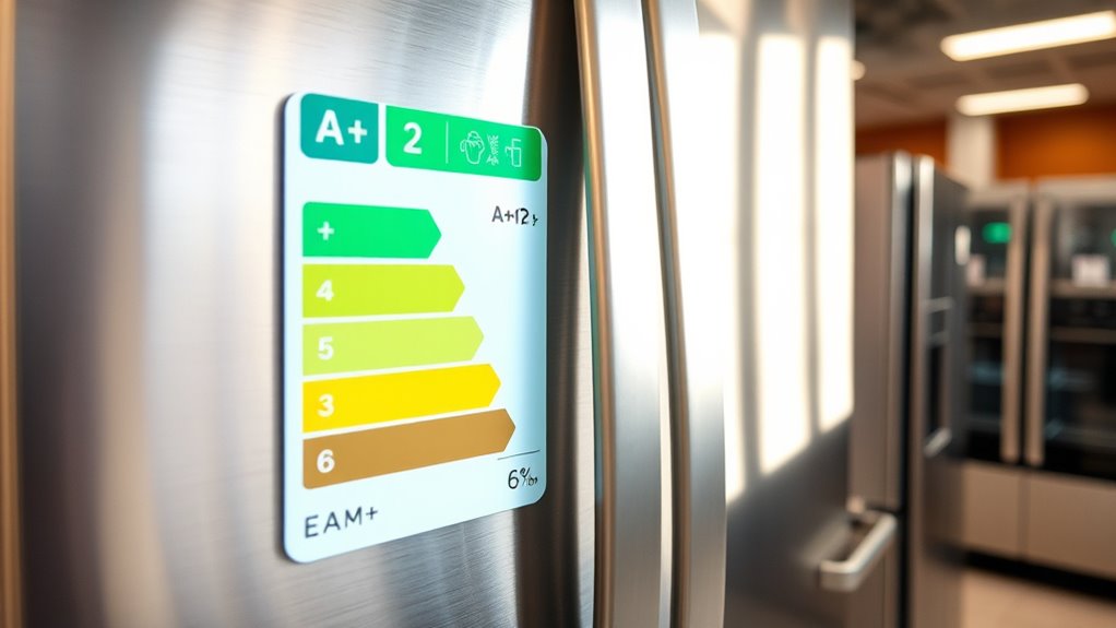 Have you ever wondered what those energy labels and certifications really mean? They’re more than just stickers; they provide valuable info about an appliance’s efficiency and environmental impact. Labels like ENERGY STAR or the EU Energy Label indicate how well an appliance conserves energy compared to standard models. The ENERGY STAR logo shows the appliance meets strict efficiency criteria, helping you save on utility bills and reduce emissions. Certifications often include details like annual energy consumption, which helps you compare models easily. Understanding these labels allows you to make smarter choices, ensuring you pick appliances that are both effective and eco-friendly. Additionally, color accuracy and contrast ratio are important factors to consider for energy-efficient home theater setups, as they influence both image quality and power consumption. Being aware of seasonal variations can also guide you in choosing appliances that perform optimally under different conditions, further enhancing your sustainability efforts. By paying attention to these indicators, you can confidently select appliances that align with your budget and sustainability goals, while also considering energy consumption metrics that directly impact your monthly utility costs.