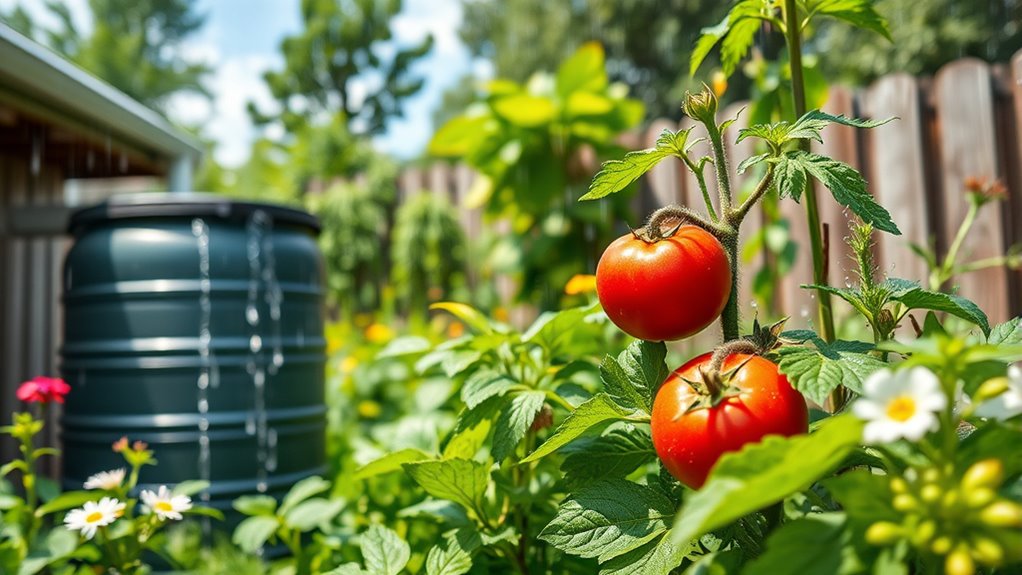 Did you know that rainwater is naturally better for your plants than tap water? It’s free of chemicals like chlorine and fluoride, which can harm plant roots over time. Rainwater also contains essential nutrients such as nitrogen, potassium, and calcium, promoting healthier growth. Using rainwater guarantees your plants receive a pure, balanced source of hydration that boosts their vitality. Additionally, harvesting rainwater can help conserve water resources and reduce your environmental footprint. Rainwater harvesting also minimizes the reliance on municipal water supplies, fostering sustainable gardening practices. Incorporating water conservation techniques into your gardening routine further enhances sustainability and supports eco-friendly practices.