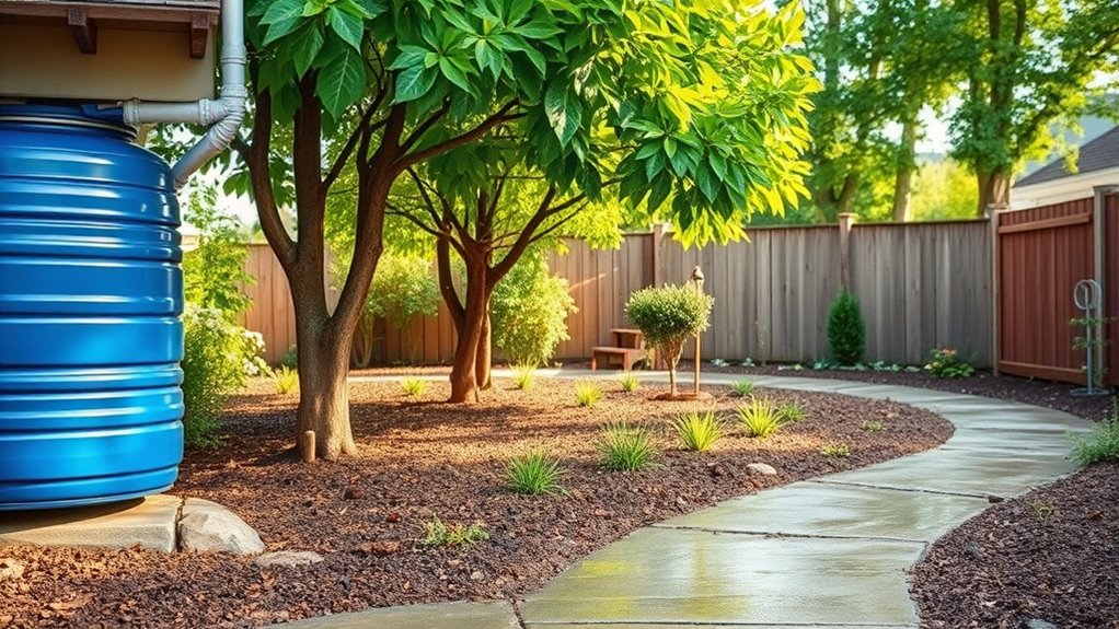 Rainwater harvesting helps reduce stormwater runoff by capturing and storing excess water that would otherwise flow quickly across surfaces. When you collect rainwater, you prevent large volumes from overwhelming drainage systems, decreasing the risk of flooding. This slows down water movement, giving soil more time to absorb moisture, which minimizes erosion on your property. By reducing runoff, you also protect nearby waterways from pollutants carried by fast-moving water, helping keep local ecosystems healthy. Additionally, less runoff means less erosion of your landscape, preserving plant roots and soil structure. Installing rain barrels or underground tanks effectively captures rainwater, allowing you to control water flow during heavy storms. Ultimately, your efforts create a safer, more stable environment around your home while conserving valuable water resources.