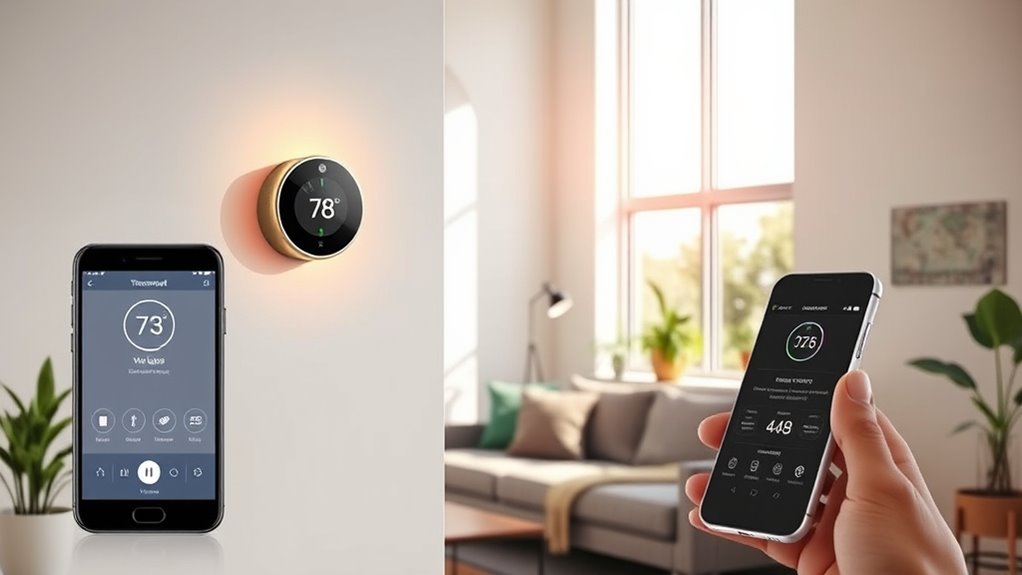 Choosing the right user control options can profoundly impact your energy savings with a smart thermostat. I love how programmable schedules let me set specific times for heating and cooling throughout the week, making it super convenient. With remote access via mobile apps, I can monitor and adjust my home’s temperature from anywhere, which really helps save energy. Plus, voice control compatibility with Alexa or Google Assistant means I can make hands-free adjustments easily. The geofencing feature automatically adjusts settings when I’m away, ensuring no energy is wasted. Ultimately, temperature sensors and multi-zone control let me optimize comfort in different areas, reducing unnecessary energy expenditure. These options truly enhance both efficiency and comfort in my home.