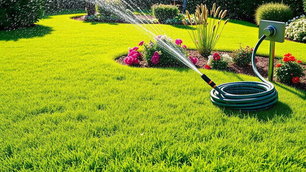 Understanding water pressure compatibility is vital for achieving even watering in my garden or lawn. I’ve learned that the ideal pressure for most sprinkler systems typically ranges between 30-80 PSI. Insufficient pressure can lead to dry spots, while excessive pressure might cause misting and waste water. It’s important to choose a system designed for a specific pressure range to avoid damaging components. When evaluating my water source, I also consider the flow rate; lower flow rates may mean I need fewer sprinkler heads to maintain adequate pressure. Before installation, I always test the water pressure and adjust settings or add pressure regulators as needed. This guarantees my sprinkler system operates efficiently and keeps my lawn lush and green.